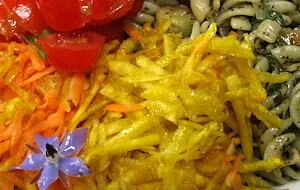 Although it is of course very nice cooked and sliced, that's not all you can do with beetroot. Here we have also made a raw grated beet and carrot salad, served with pasta & fresh basil pesto , chadwick cherry tomatoes, and garnished with edible borage flowers. (You'll find all the ingredients in the catalogue apart from the pasta) It's the yellow in the middle - what a great colour!