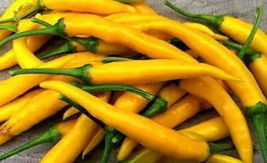 The peppers start out luminous yellow-green and then ripen to bright red; their heat raw is quite strong, but it mellows on cooking, so one to three peppers per dish gives a good flavour without being too risky.