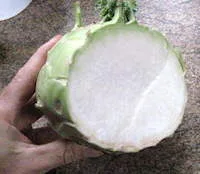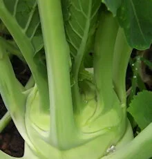 Kohl Rabi is a really easily-grown vegetable from the cabbage family that makes a large round ball just above ground. The inside is tender, and has a wonderful flavour that can best be described as partway between courgette and broccoli.