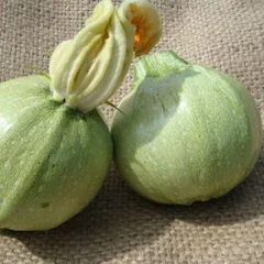 The “Courge Ronde de Nice” is an ancient variety from the region of Nice in France. Harvest when about tennis-ball sized & cook as a normal courgette.