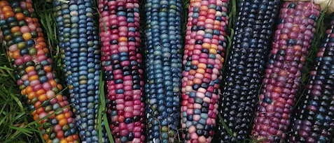 A multicoloured flint corn for flour or popping, this is the prettiest corn we have ever grown.
