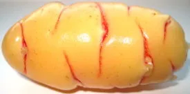 This variety yields well for us, and makes consistently large and even shaped tubers in a pretty creamy yellow with red markings around the eyes.