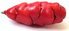 A strain that makes beautiful orange tubers with swirly scarlet outlines over the eyes.