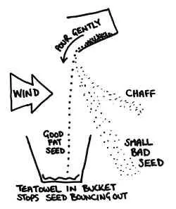 Lots of seed comes in pods, or with feathery bits attached. Usually stomping on the dry seedpods will break it all up & release the seed, but then how do you get rid of all the bits? Often the answer is to winnow. Because the bits are lighter than the seed, they blow away in a breeze. The process is as follows: